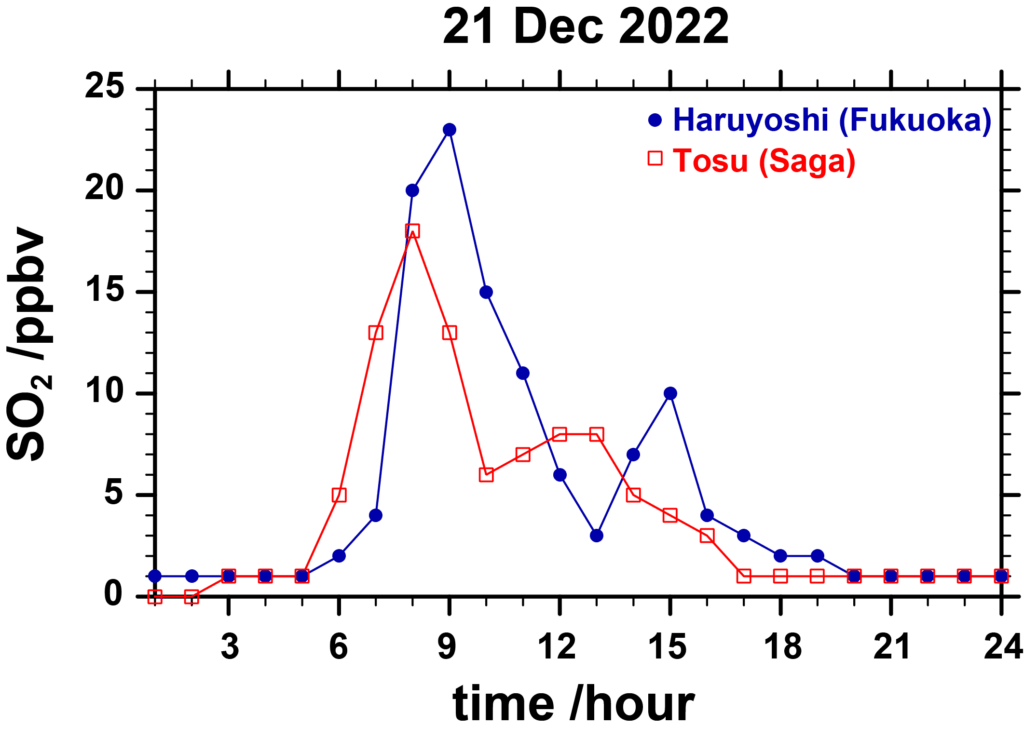 今朝、福岡で二酸化硫黄 (SO2) 濃度の上昇がみられ、福岡市 (春吉) では 0.023 ppmv (1時間値) を記録しました (環境省そらまめくんサイトより)。なお福岡大学でも濃度上昇がみられました。SO2の起源は、越境大気や船舶などの人為起源と、火山などの自然起源があります。福岡市から久留米まで広範囲で濃度が高かったことから自然 (火山) 起源の可能性があります。