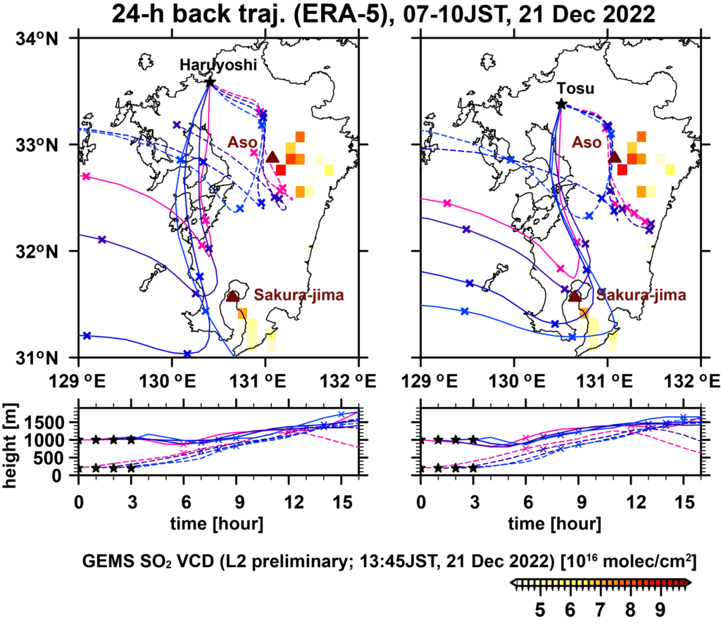 (27 Dec 2022, 追記; 16 Feb 2023, 追記修正) 高濃度イベント前日の12月20日の衛星観測 (GEMS, L2 preliminary; 鉛直積算量 (VCD) ) をみると、桜島や阿蘇近辺で大気中のSO2濃度が高く、それらの地域でSO2の放出があったと考えられます (南東方向に流れています)。また後方流跡線解析によると (起点高度200 m および 500 m, ERA-5気象データ利用) 福岡の空気は九州中部・南部から流れてきており、高濃度SO2は阿蘇山や桜島起源の可能性があります (下図)。なお地表付近では東風成分が強く、阿蘇山の寄与が大きいことも考えれますが、詳細な解析が必要です。